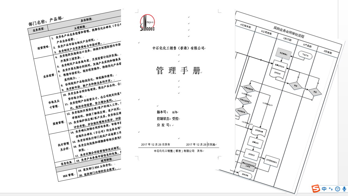 中石化化工銷售(香港)有限公司QHSE體系建設(shè)取得階段性成果,管理手冊、部門職能崗位職責(zé)、業(yè)務(wù)流程及節(jié)點說明、風(fēng)險識別與管控、法規(guī)識別等體系文件已經(jīng)初步確定,將在公司總經(jīng)理辦公會上做最后的審核,計劃于12月28日正式上線發(fā)布實施。