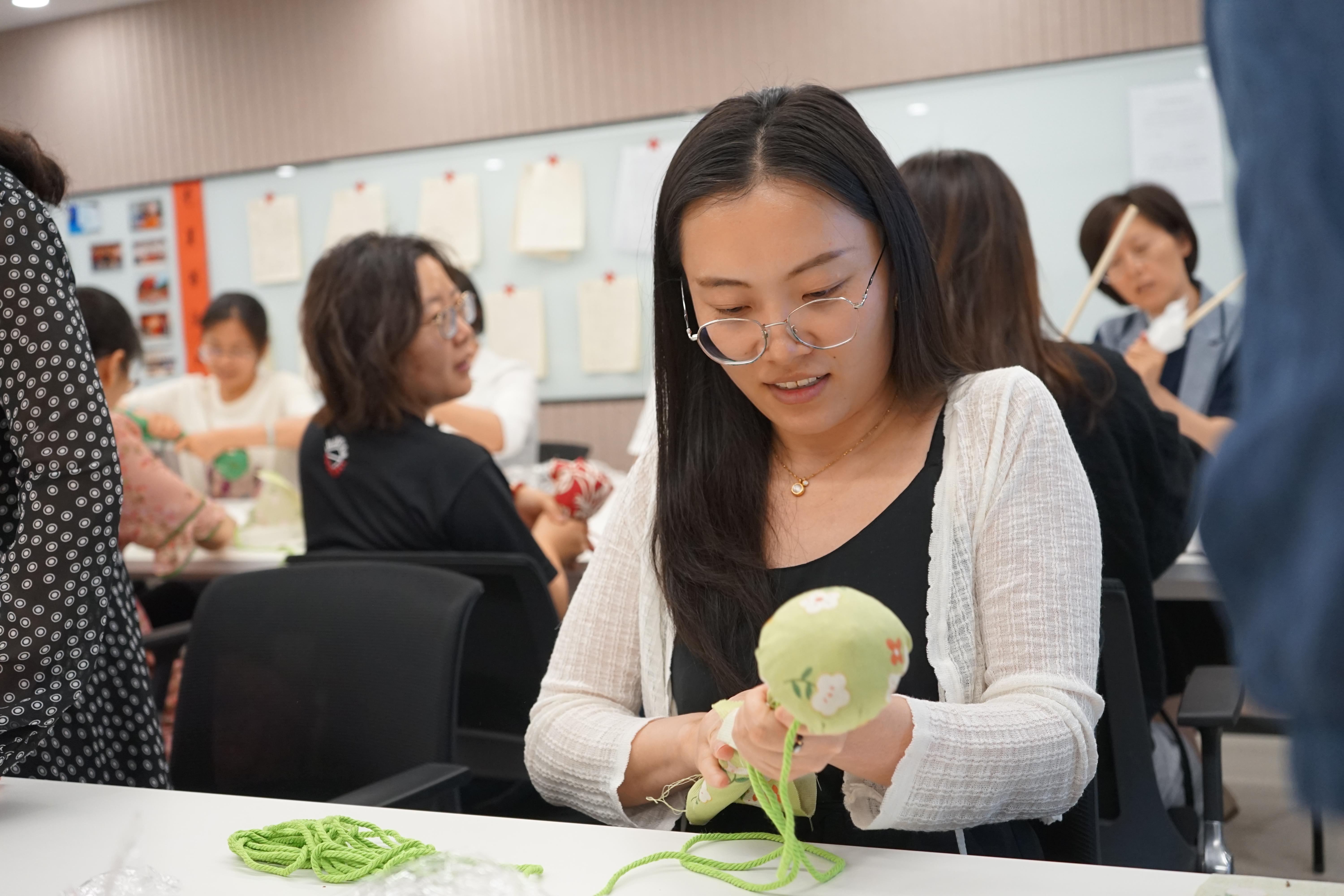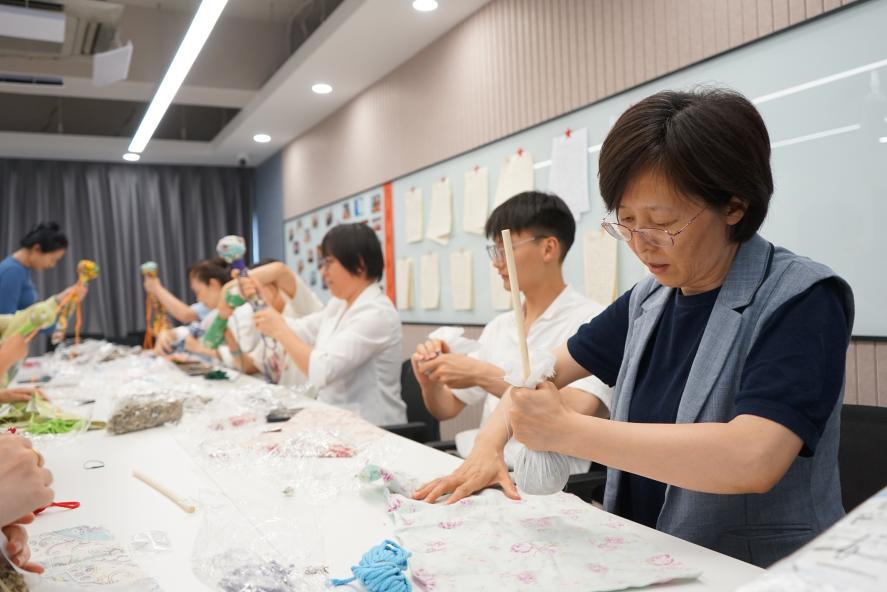 活動(dòng)伊始,活動(dòng)組織者首先向大家介紹了端午節(jié)掛艾草的民俗背景及艾草藥用價(jià)值和中醫(yī)養(yǎng)生知識(shí),讓大家對(duì)艾草有了更深入的了解;進(jìn)入手工DIY環(huán)節(jié),向大家現(xiàn)場(chǎng)演示了艾草錘的制作方法和使用方法。隨后,員工們紛紛動(dòng)手嘗試,按順序鋪平布料、將曬干的艾草放在中間,用布料裹住,捏成一個(gè)緊實(shí)的圓形,插入木棍,拿出繩子將剩余的布料緊緊捆綁成柱形,大家有條不紊,一邊完善手工步驟,一邊互幫互助,一個(gè)個(gè)精致的艾草錘在大家的手中逐漸成形,隨后大家用做好的艾草錘敲敲肩頸、捶捶后背,拍打之間,經(jīng)絡(luò)暢達(dá)、身心舒暢,整個(gè)活動(dòng)現(xiàn)場(chǎng)充滿(mǎn)了歡聲笑語(yǔ),氣氛熱烈而融洽。